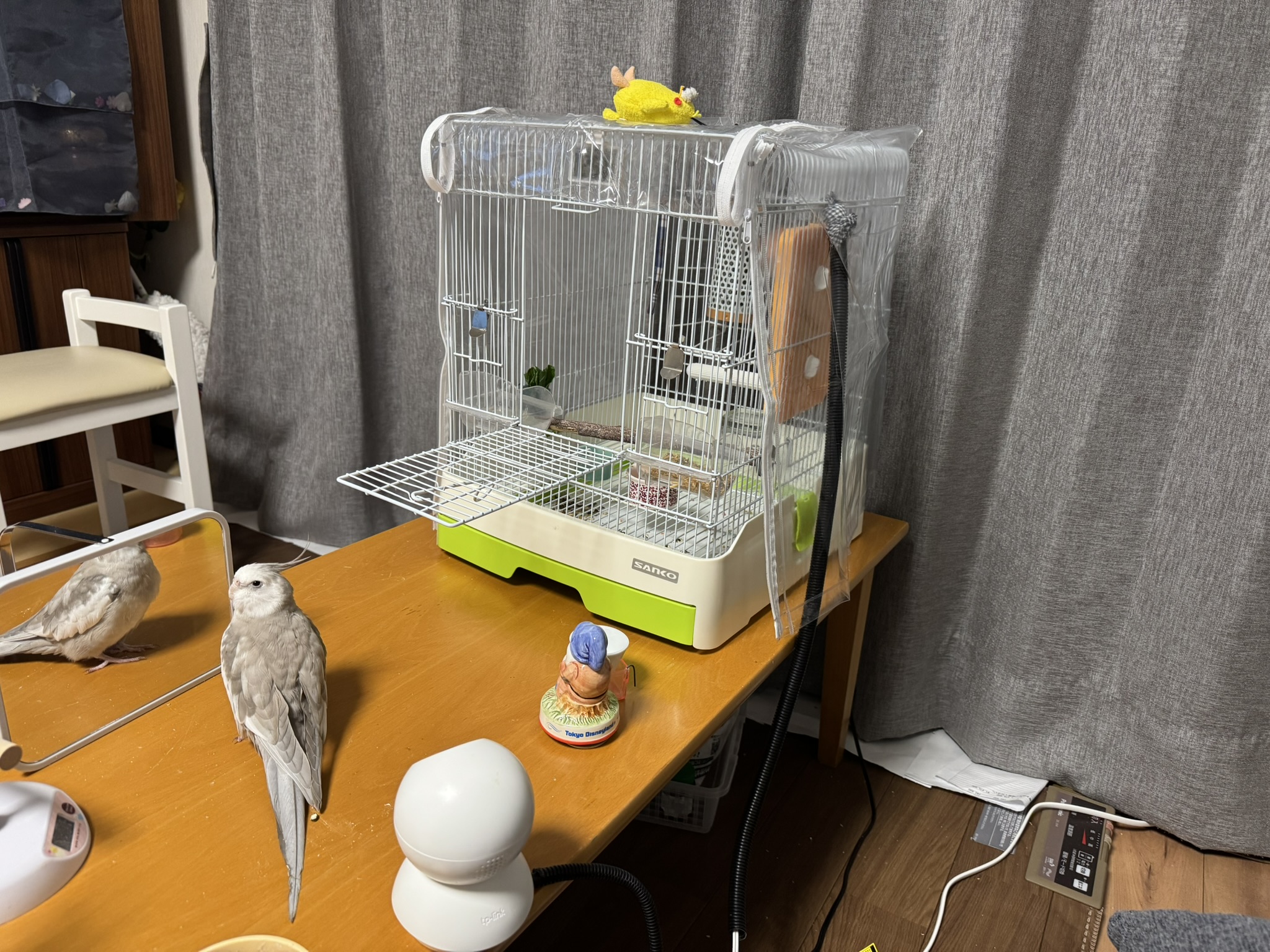 寒くなってきたので鳥かごにビニールのカバーを被せて