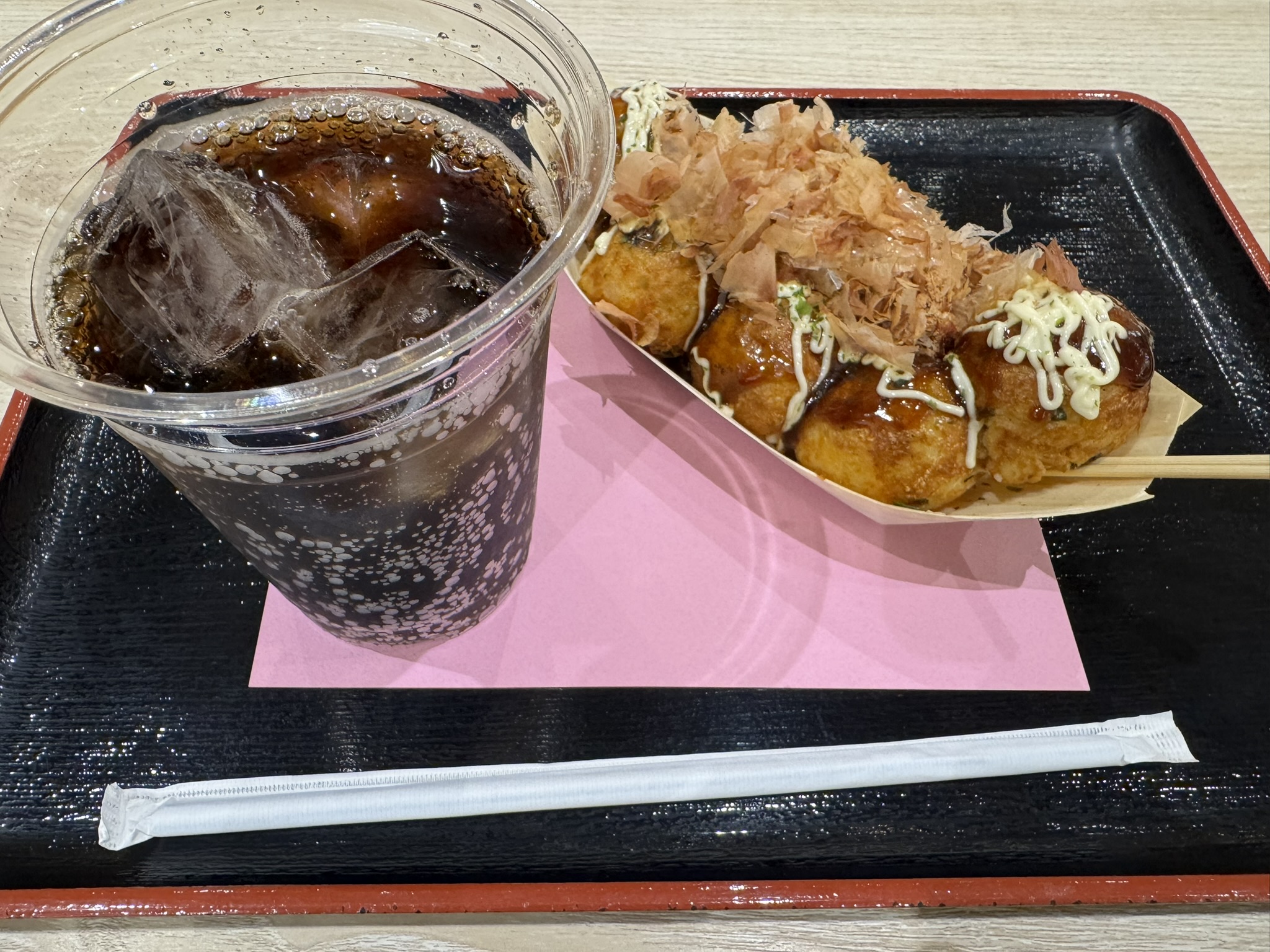 今度は壊れにくそうな新しいメガネを買って、仕上がるまでタコ焼き食べながら待ってた。