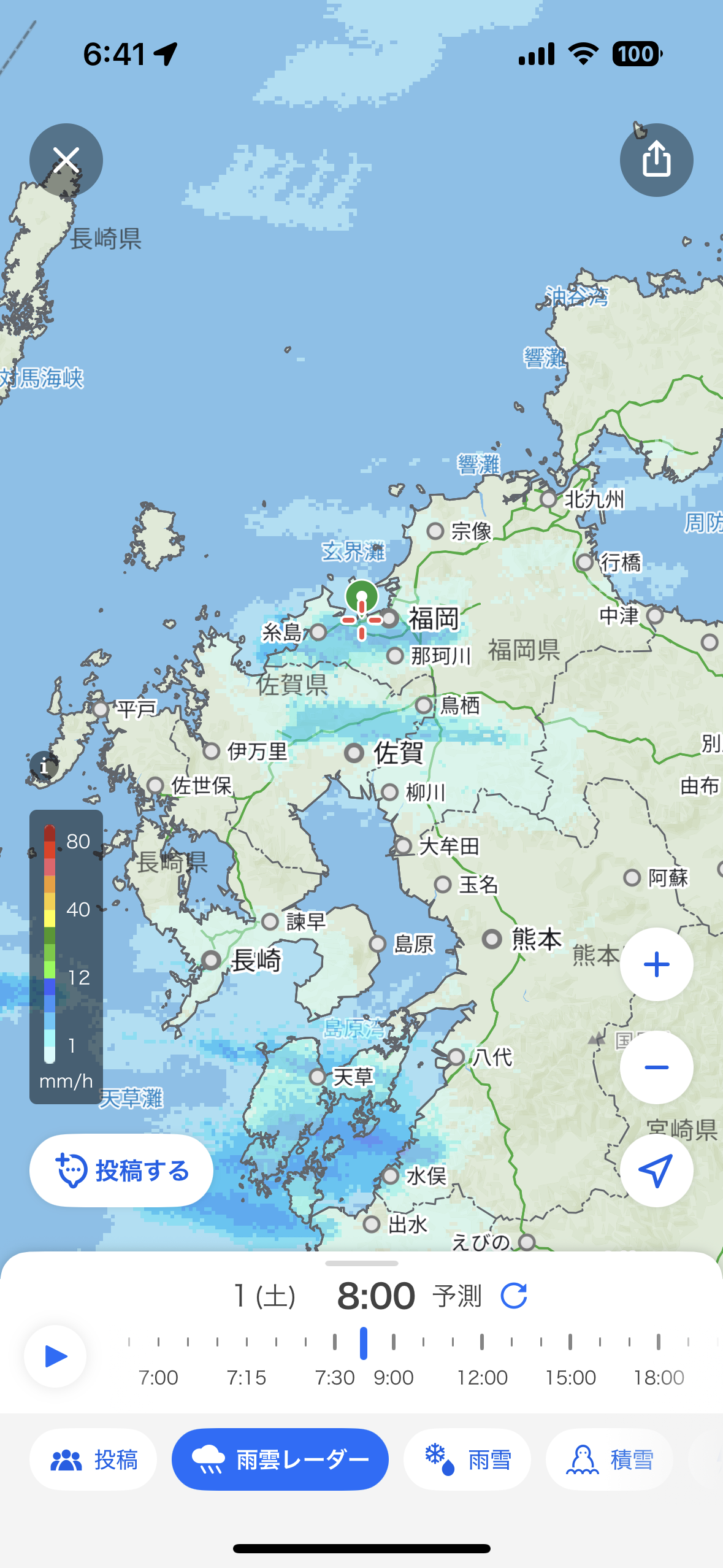 9時頃には止みそうだけど、路面が乾くのは10時頃になるかな。