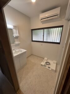 ここにエアコンをつけて欲しいっていうんで2.2Kwの一番小さい奴をつけたけど一瞬で温かくなるね。住宅設備機器の中で一番お金がかかるのが浴室の改装だと思うけど、毎日使うものだから投資する価値はありますよ。
