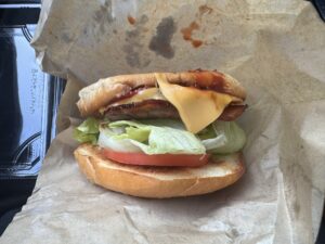 車内で食べたけど、美味いけど値段とのバランスを考えると唐津バーガーの勝ちだよ。