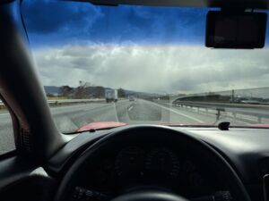 途中サービスエリアで休憩した時の写真だけど、どうもこの前交換したバックカメラのガイドラインがすごくズレてる。
