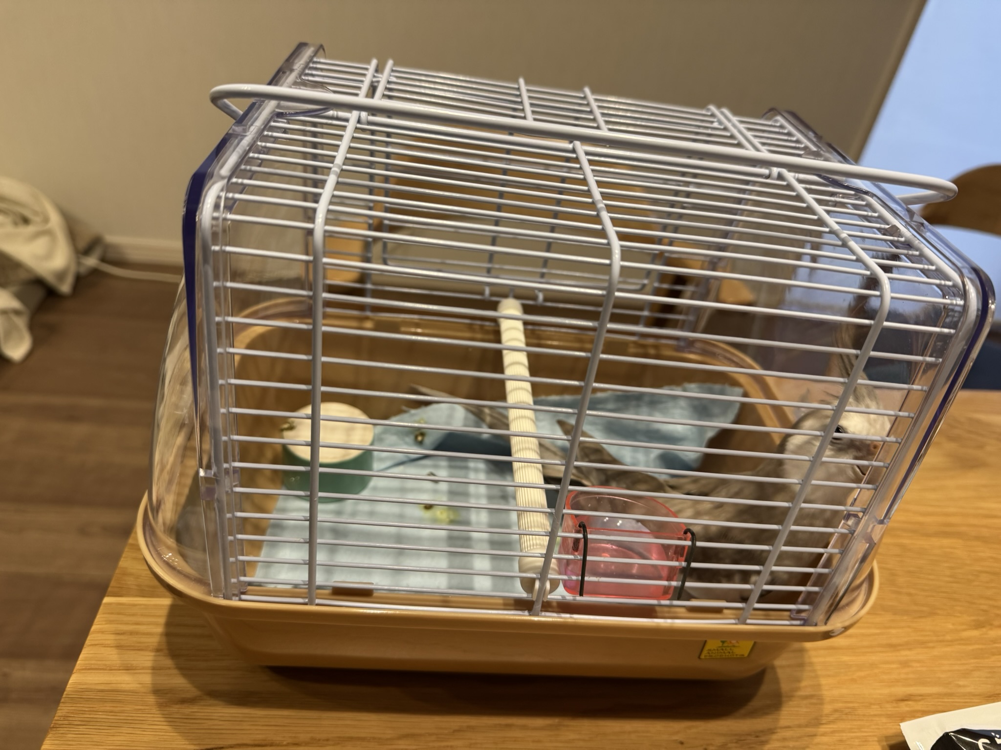 帰りもこの小さなケージに入れて移動。1時間なのでおとなしくしてます。