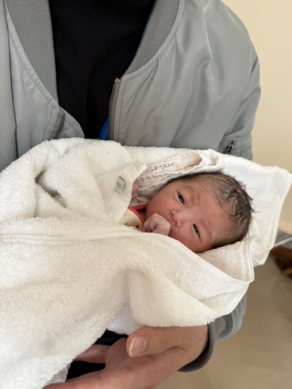 朝まで痛みに耐えたらしい。生まれる瞬間は麻酔入って痛みは和らいだみたいだけど