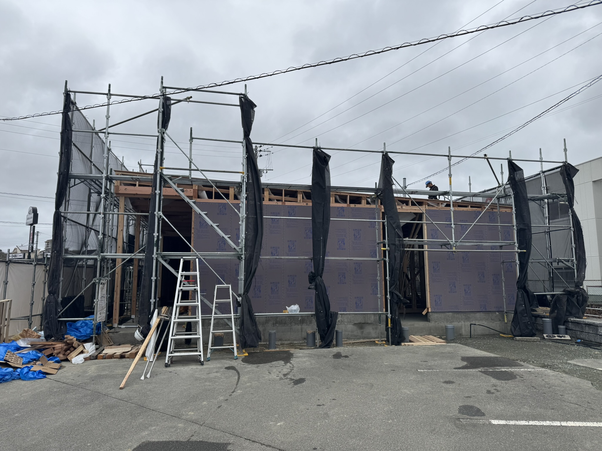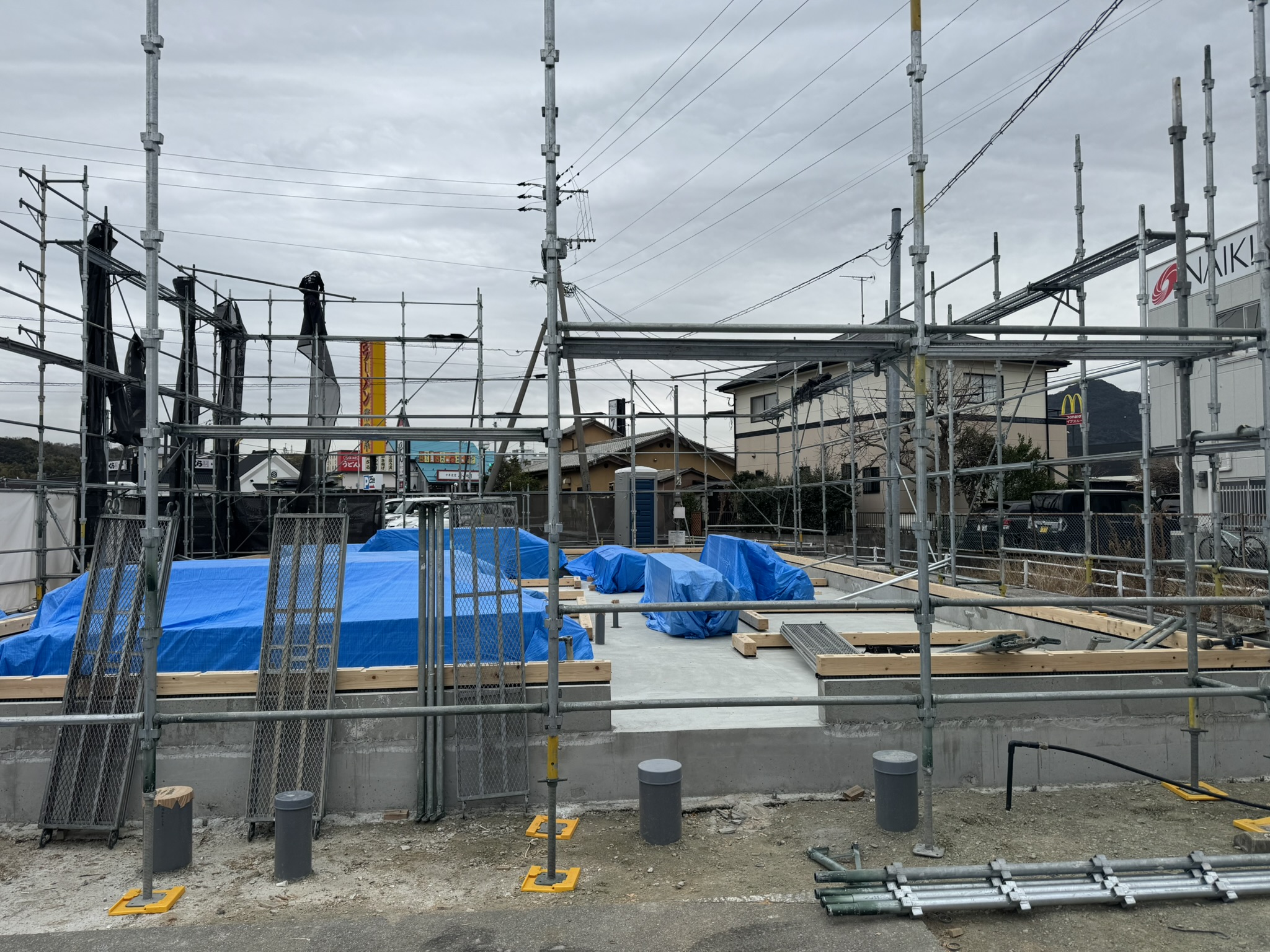 翌日は先行足場を架ける。その前に材料は基礎の中へ。