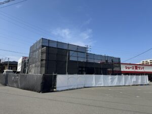 外壁もほぼ貼り終わってメッシュシート越しに建物の形が見えますね。