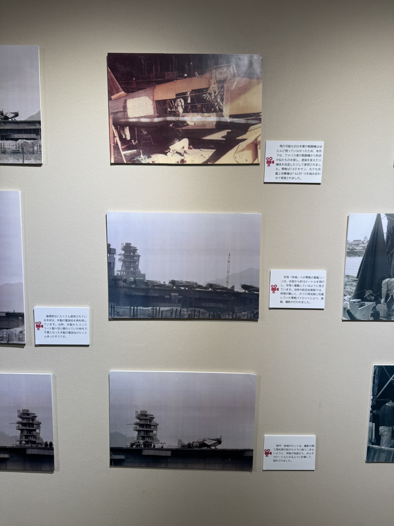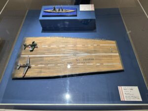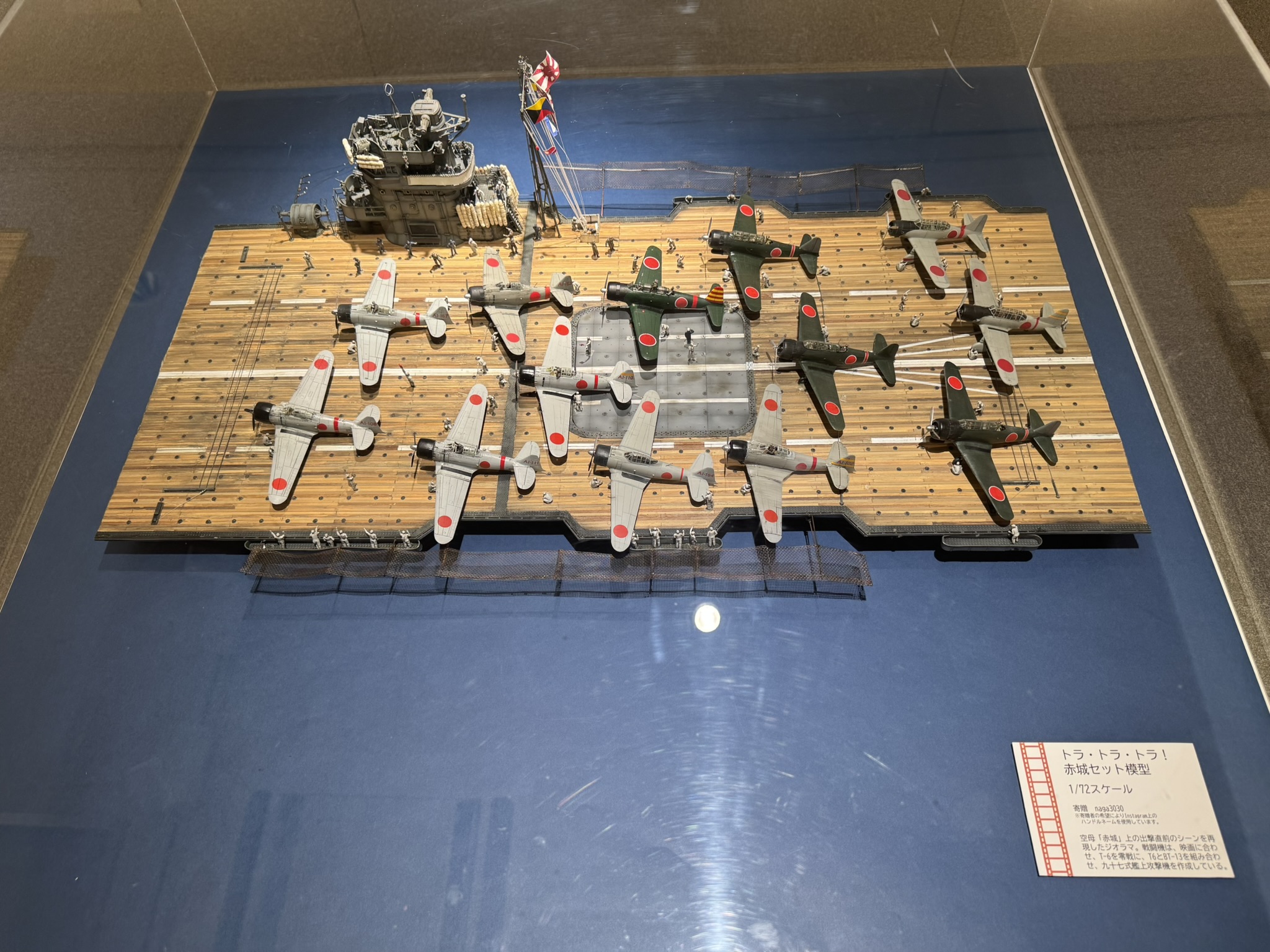 赤城の飛行甲板1/72スケールの模型。アメリカの飛行機を零戦に見えるように改造して撮影してたらしい。