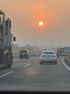 帰りの高速道路。18時過ぎの夕陽。なんか知らないけど遠くが見渡せない位に霞んでるから