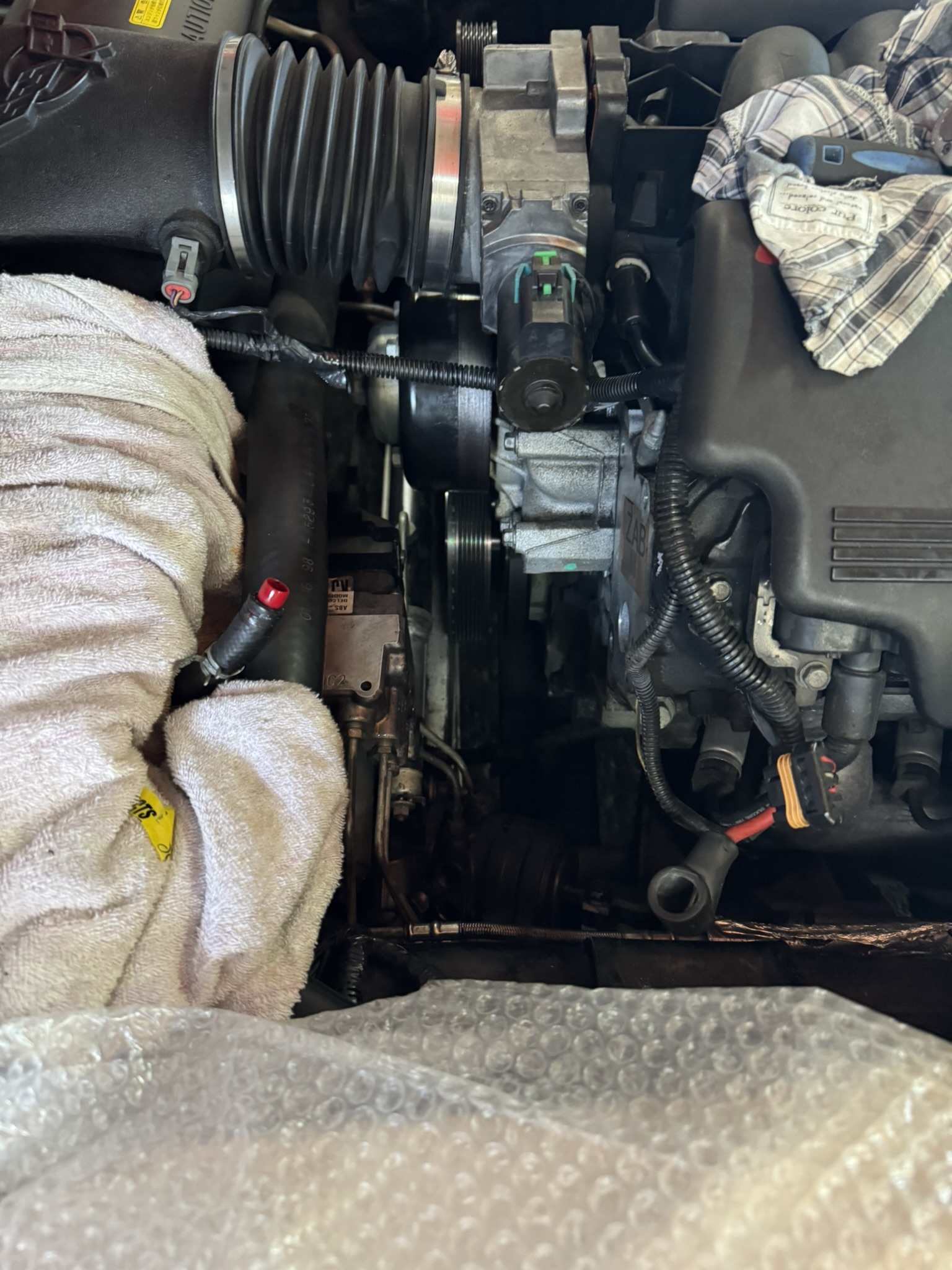 ブラケットごとプーリーを外さずにポンプを摘出する。youtubeにやり方出てたから真似してみた。まあ知恵の輪みたいな感じであちこち干渉するところをずらしたりねじ緩めたりして
