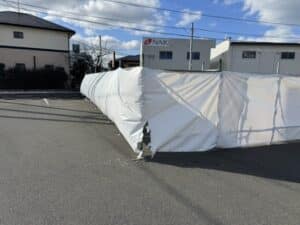 何度かロープで補強したりしてみたけど、奥の面はもうシートがボロボロなので撤去。メッシュシートに張り替えます。