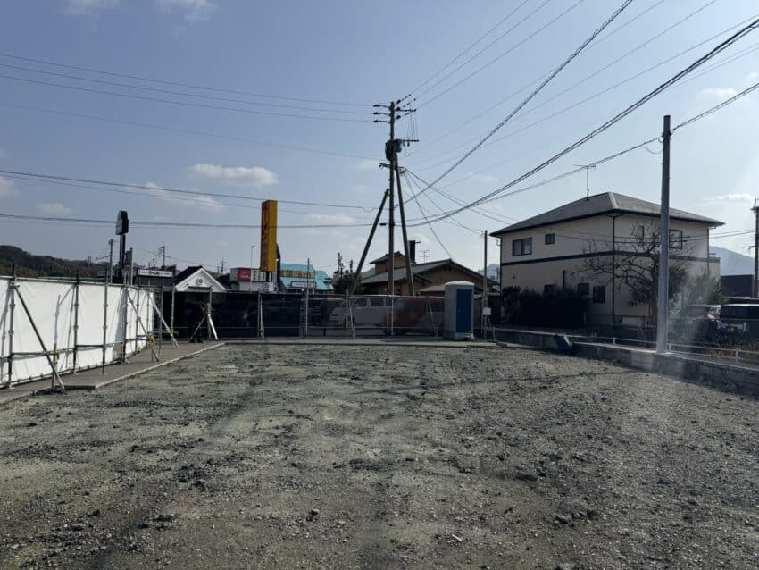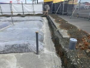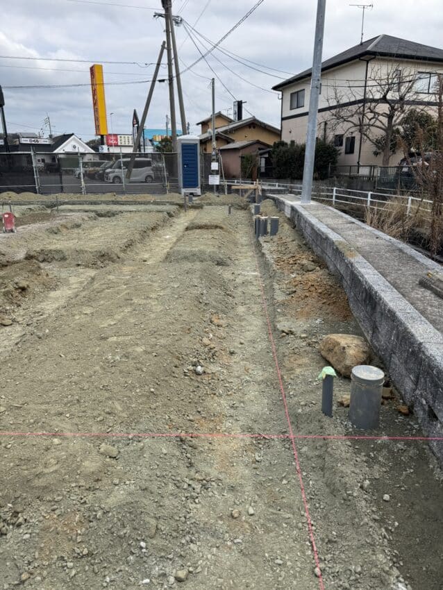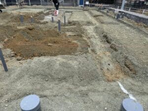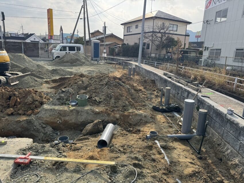建物が建ったらせまくて後から掘れないので先に重機で掘削して配管を埋めます。