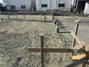 設備の配管埋設が終わりました。次は基礎工事の掘方になります。