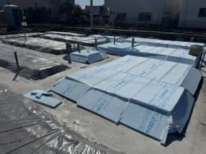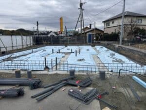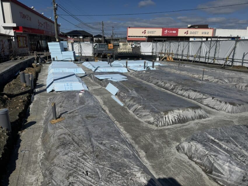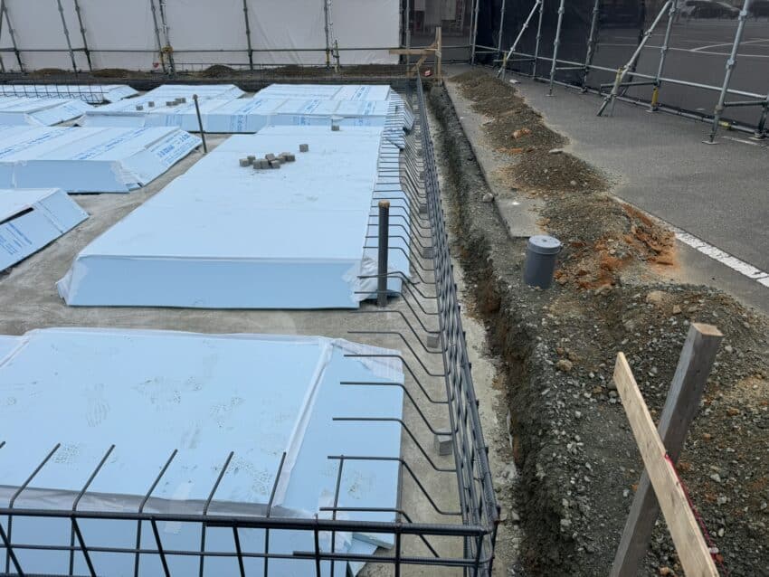 基礎のスラブ下に断熱材を敷き込みます。
