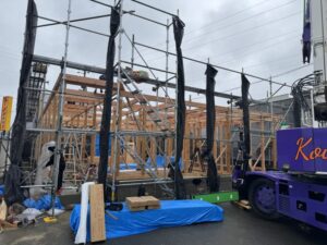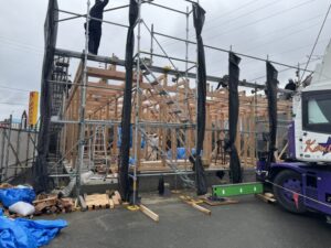 小屋束を立てて母屋を施工しています。