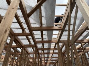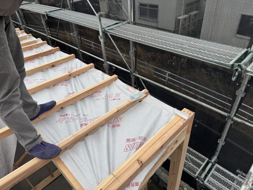 母屋の上に透湿シートを挟んで垂木を施工。ウレタンの吹き付け断熱なので垂木間の通気層が塞がらないようにします。