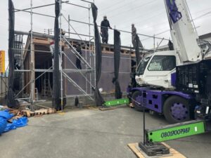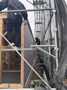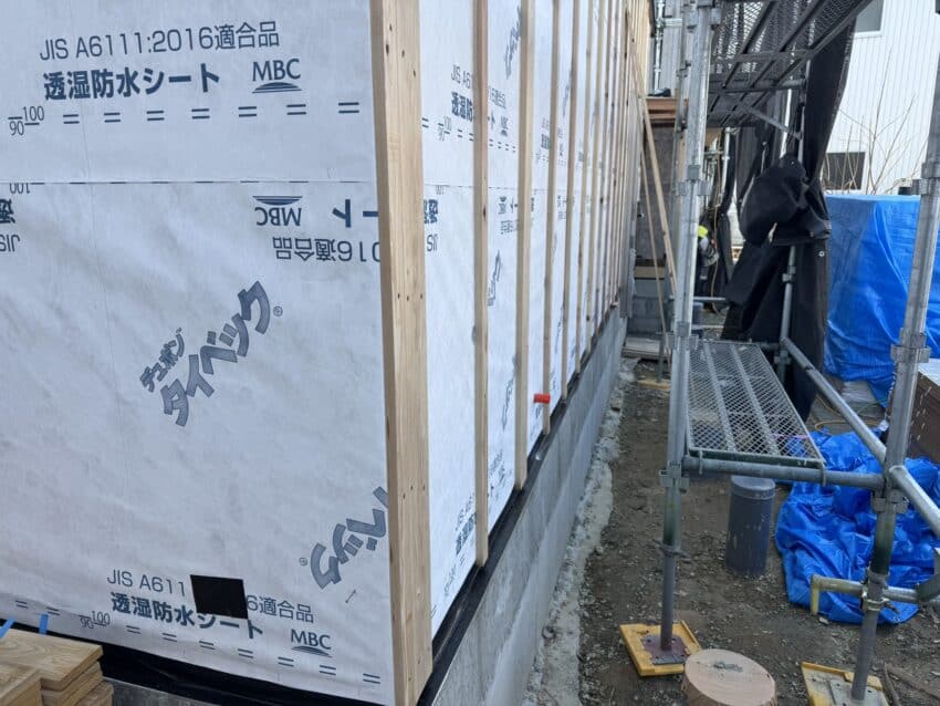 並行して外部は耐力面材を貼っていきます。