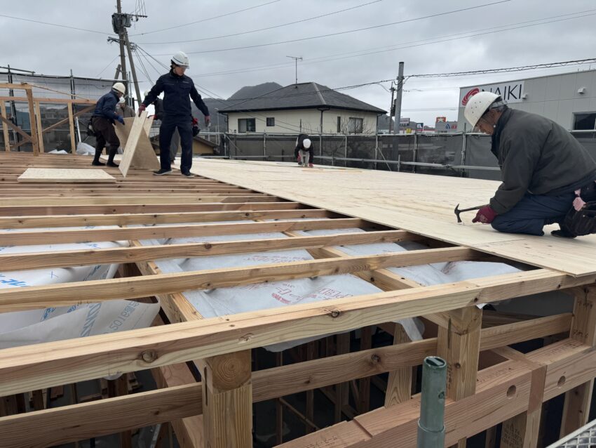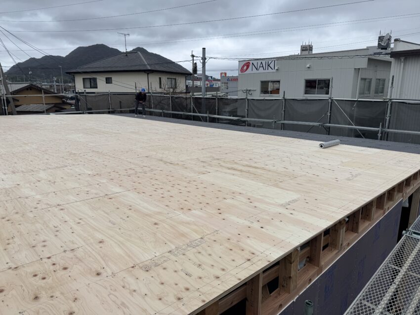 屋根の野地板を施工中。