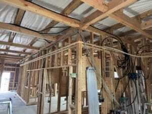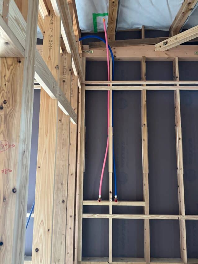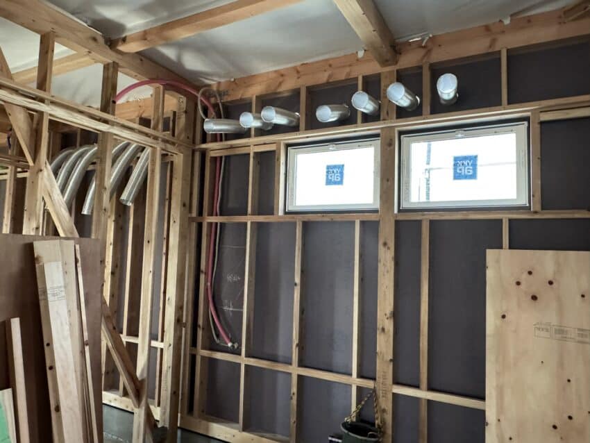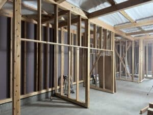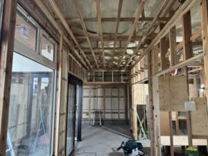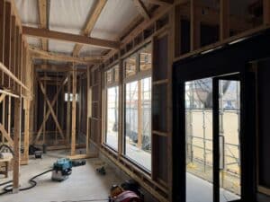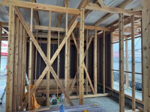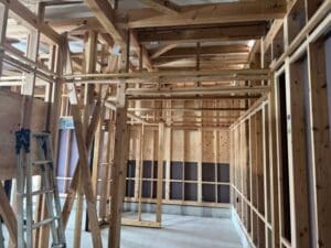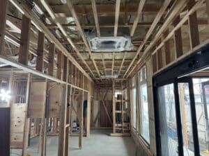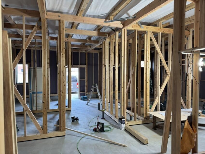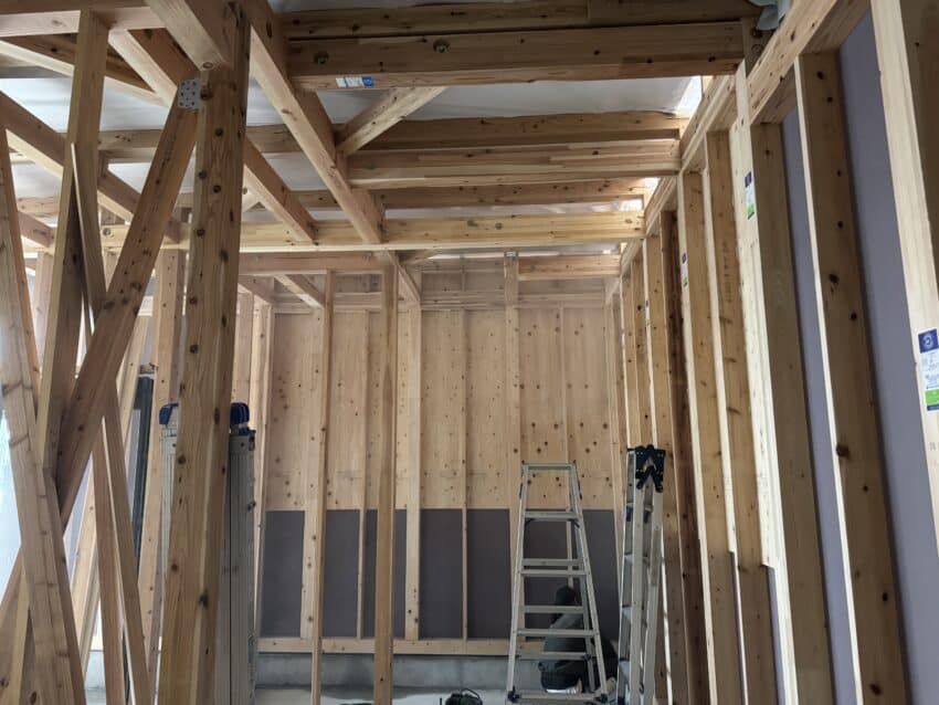 室内は扉が着く壁の鴨井と間柱を施工しています。