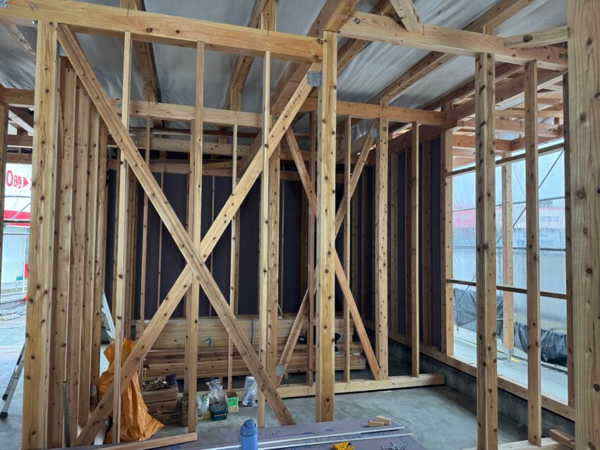 ホールダウンが1本も無いんですよ。この建物。一番力が掛かる金物でもシナーコーナーでOK。筋交いプレートも取り付け終わってます。来週は窓サッシが入荷しますので、取り付けが済んだら外壁のサイディング工事が始まります。